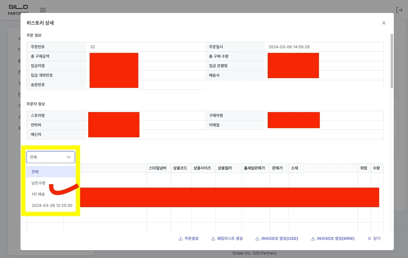 • 원하는 배송정보를 선택해서 아래 주문생성/패킹리스트생성/INVOICE생성을 클릭해야함