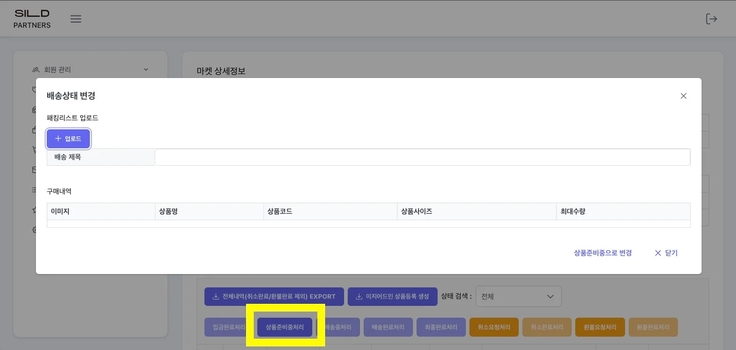 • 상품준비중으로 변경시 브랜드로부터 전달받은 패킹리스트를 업로드 해야 함(마켓등록절차 6)