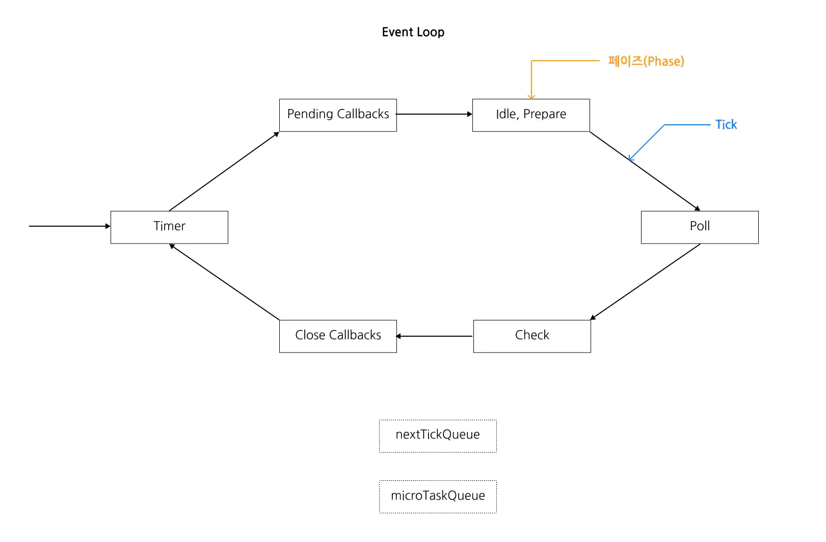 이벤트 루프는 싱글스레드라서 Tick의 순서대로 한번씩 돌아서 큐에 쌓여있는 작업을 처리