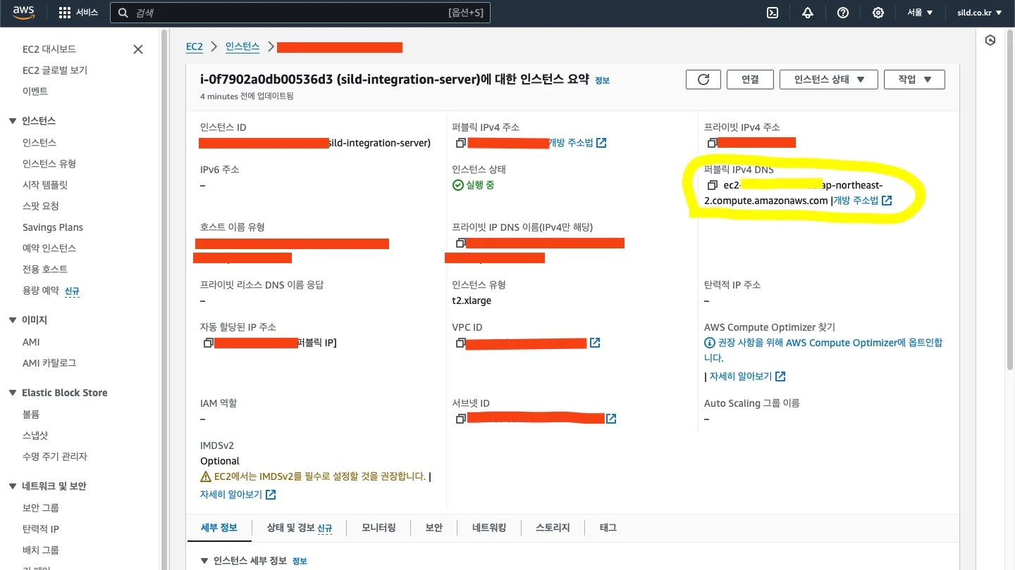 EC2 인스턴스(링크) 에서 퍼블릭 IPv4 DNS 링크를 복사(노란색 부분)