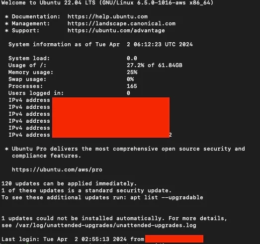ssh -i sild-integration-server-key.pem ubuntu@{ec2~amazonaws.com으로 끝나는 IPv4DNS 주소}아래처럼 접속 정보가 출력되면 접속 성공