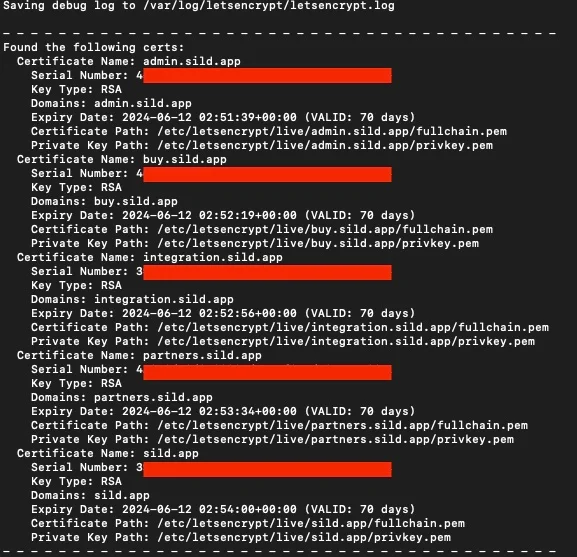 sudo certbot certificatesVALID 기간이 90일로 늘어났으면 성공, 나머지 도메인들도 모두 같은 작업 반복