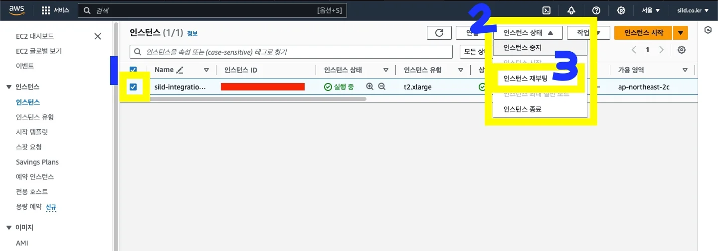 체크박스 클릭(1), 인스턴스 상태 셀렉트박스 클릭(2), 인스턴스 재부팅(3) 클릭