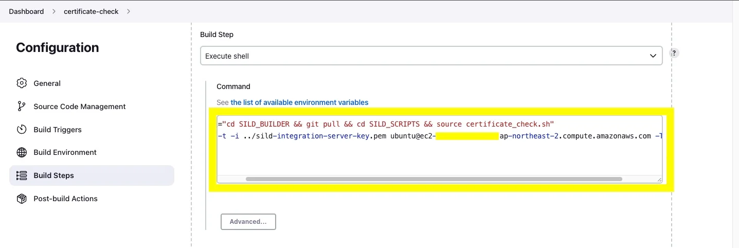 ssh -i sild-integration-server-key.pem ubuntu@{ec2~amazonaws.com으로 끝나는 IPv4DNS 주소} sudo docker exec -it jenkins /bin/bash cd /var/jenkins_home/workspace ssh -t -t -i sild-integration-server-key.pem ubuntu@{ec2~amazonaws.com으로 끝나는 IPv4DNS 주소} -T cd SILD_BUILDER '&&' git pull '&&' cd SILD_SCRIPTS '&&' source certificate_check.shfingerprint를 등록할지 나오고, yes 입력 하면 아래와 같이 등록됨