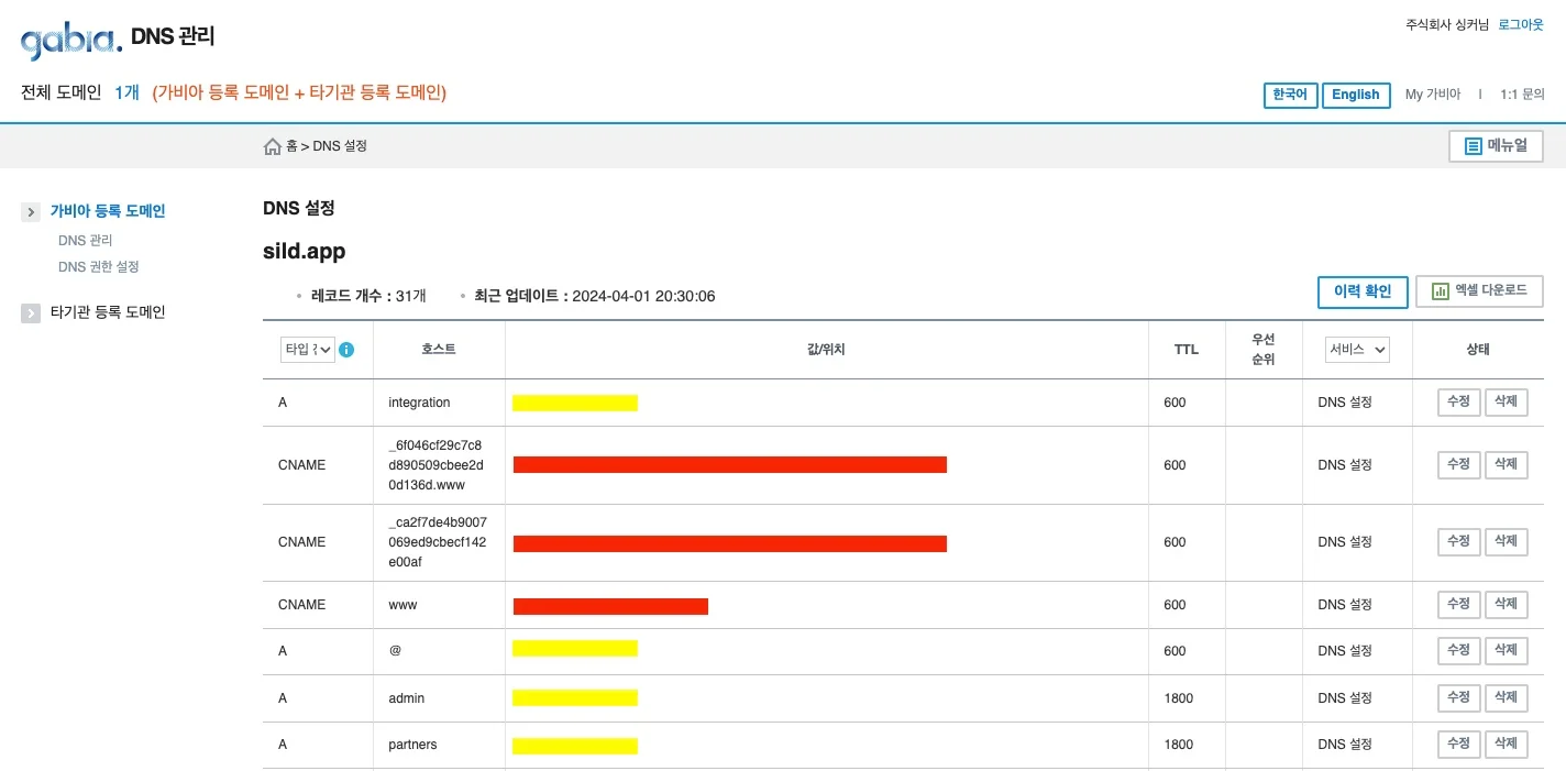 가비아 DNS 호스트 IP값 변경