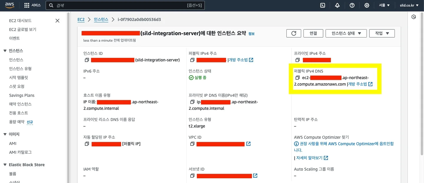 인스턴스 상세 페이지에서 퍼블릭 IPv4 DNS가 인스턴스 재부팅시 변경되며, 해당 주소를 사용하는 모든 곳을 수정해야함